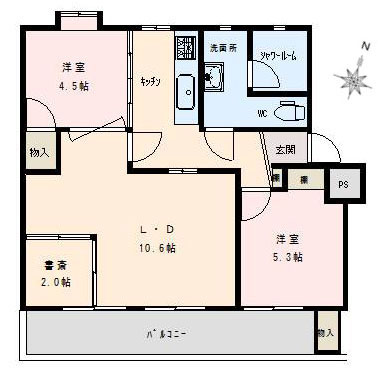 | 間取詳細 | 洋室4.5帖・洋室5.3帖・書斎2帖・リビングダイニング10.6帖・キッチン |